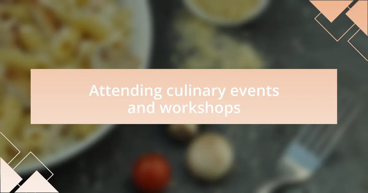 Attending culinary events and workshops has been a game-changer in my networking journey. I remember my first local food festival — the aromas, the buzz of conversation, and the chance to mingle with chefs and food enthusiasts alike. Engaging with others in a hands-on environment made it easier to strike up conversations and share ideas. Have you ever walked away from an event feeling inspired and connected to new friends and mentors?